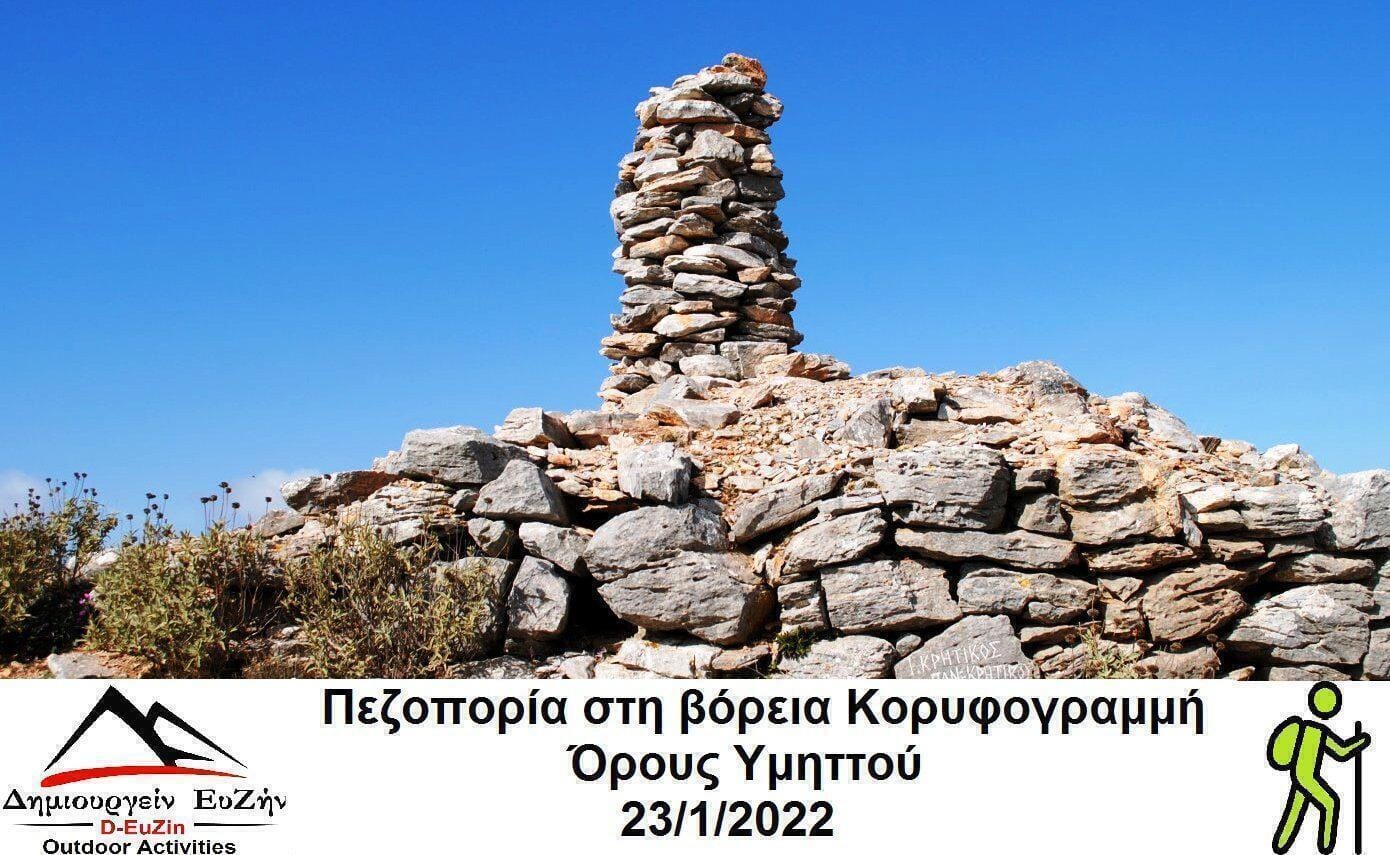 Την Κυριακή 9/1/2022 σας προσκαλούμε να πεζοπορήσουμε στη βορινή κορυφογραμμή του Όρους Υμηττού, ανακαλύψουμε τις 3 κορυφές του βουνό του Υμηττού, σε μία ωραία ανάβαση για όλους. Μια πολύ ενδιαφέρον πεζοπορία για όλη την παρέα , για να γνωριστούμε τα μυστικά του Υμηττού και να απολαύσουμε τα όμορφα μονοπάτια του βουνού. Στην μέση της διαδρομή μας οπού θα κάνουμε το μεγάλο διάλειμμα μας, θα απολαύσουμε την θεά από ψηλά και θα αναφερθούμε για την ιστορία του βουνού.