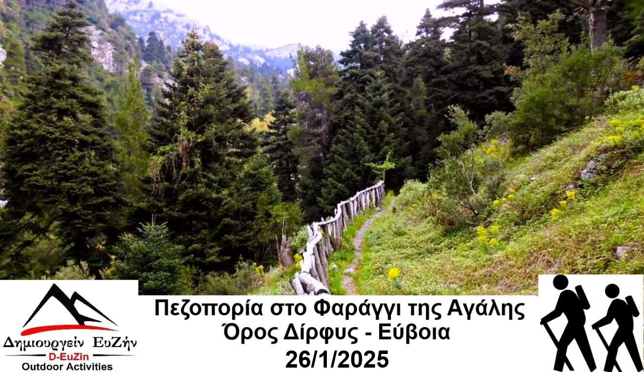 Την Κυριακή 26/1/2025 σας προσκαλούμε να περπατήσουμε σε μια υπεροχή διαδρομή στο Φαράγγι της Αγάλης με πορεία προς την πηγή Κρυόβρυση – την πηγή Κράτεια στα 730 μέτρα υψόμετρο. Θα περπατήσουμε στο φαράγγι της Αγάλης και θα βρούμε το ποτάμι του Μεσσάπιου με τα πανύψηλα πλατάνια του, τα τρεχούμενα νερά, τις μικρές βάθρες και τους καταρράκτες στους πρόποδες του Όρους Δίρφυς.Στις δυτικές πλαγιές της Δίρφης ξεπροβάλλει το επιβλητικό φαράγγι της Αγάλης με την πανοραμική θέα στον Ευβοϊκό κόλπο. Εντυπωσιακή διαδρομή 6,5 χλμ. με εναλλαγές και πλούσια βλάστηση που περιλαμβάνει πεύκη, θαμνώδη φυτά, αιωνόβια πλατάνια, βελανιδιές, σφενδάμια και καστανιές καθώς και σπάνια λουλούδια. Κεφαλληνιακή ελάτη φυσικά δεν λείπει μιας και την συναντάμε σε πολλά μέρη στην Εύβοια. Θα αναφερθούμε επιμέρους για το Αισθητικό Δάσος της Δίρφυς αλλά και θα μάθουμε για την τοπική χλωρίδα και την πανίδα. Αρκετά φυσικά …”μπαλκόνια” θα μας χάρισαν ωραία θέα προς την ευρύτερη περιοχή …έως και θάλασσα. Η πηγή Κράτια είναι το πιο ωραίο μέρος για μεγάλη στάση για να απολαύσουμε τη φύση σε όλο της το μεγαλείο της.