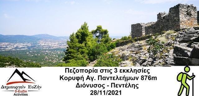 Την Κυριακή 28/11/2021 σας προσκαλούμε να περπατήσουμε στο βουνό της Πεντέλης για να ανακαλύψουμε το Δασός του Διονύσου ανεβαίνοντας στη κορυφή 876μ Άγιος Παντελεήμων. Μία πολύ ενδιαφέρουσα πορεία όπου θα γνωρίσουμε τα 3 εκκλησάκια, την Μονή , τα παλιά λατομεία του Διονύσου.