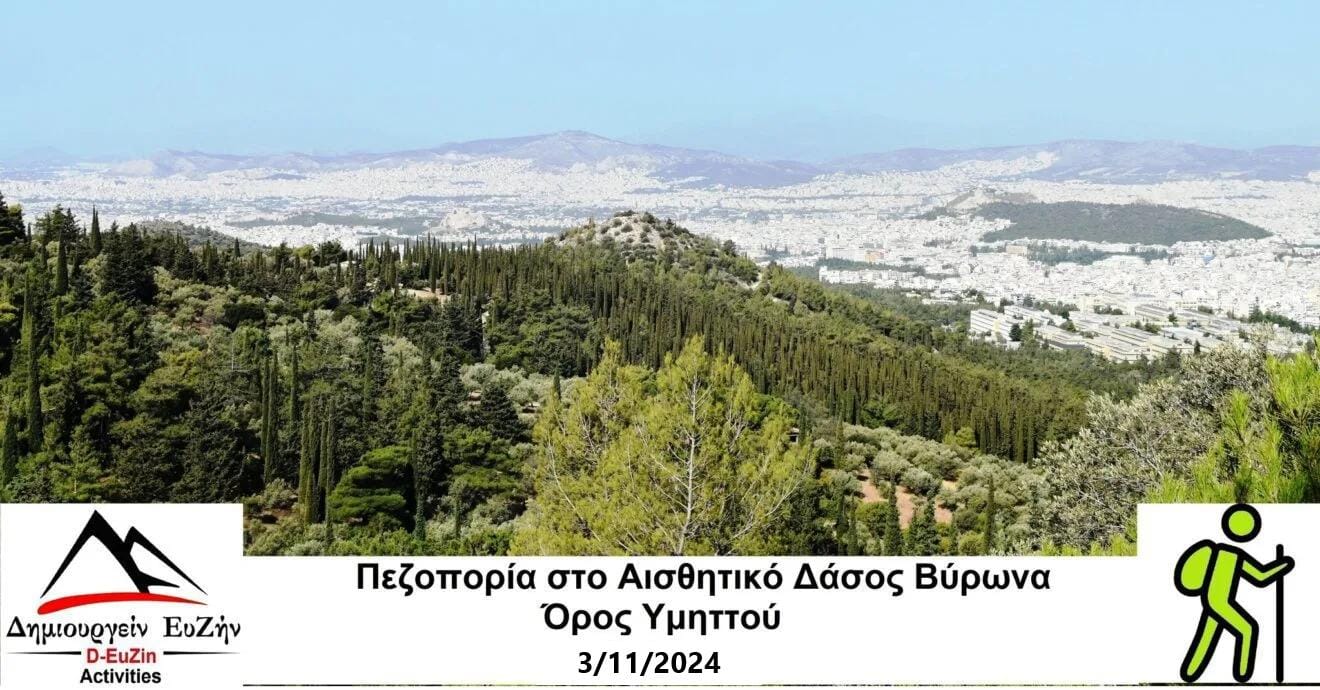 Την Κυριακή 3/11/2024 σας προσκαλούμε να περπατήσουμε σε μια υπεροχή κυκλική διαδρομή με πορεία προς τα παλιά λατομία του Βύρωνα και το αναρριχητικό πεδίο Καράβι θα περπατήσουμε στο Νότιο τμήμα του Αισθητικού Δάσους του Υμηττού. Το υπέροχο ανάγλυφο της πορείας μας θα σας ενθουσιάσει όπως και τα σημεία ενδιαφέροντος που έχει επιλέξει οδηγός μας – μη το χάσετε! Θα αναφερθούμε επιμέρους για το Αισθητικό Δάσος – το πιο ωραίο μπαλκόνι του Υμηττού, την άγνωστη ιστορία του «Τρελού» αλλά και για την τοπική χλωρίδα και την πανίδα. Το όρος του Υμηττού, βουνό της Αττικής είναι προστατευόμενος βιότοπος και Natura 2000 με μεγάλη ποικιλία πανίδας-χλωρίδας και υπεροχών κορυφών με θέα το λεκανοπέδιο της Αττικής. Ιδανική πορεία για αρχάριους πεζοπόρους και για παιδιά καθώς και για τα αγαπημένα μας 4ποδα. Στο τέλος προαιρετικά σε ένα καταπράσινο άπλωμα, θα κάνουμε ένα εισαγωγικό μάθημα Pilates, Γιατί κάνουμε Pilates? Που μας βοηθάει στην υγεία μας το Pilates? – Με καθηγήτρια Φυσικής Αγωγής (ΤΕΦΑΑ) Pilates Instructor από το χώρο μας D-EuZin Studio (Για την συμμετοχή σας, χρειαζόμαστε στρωματάκι ή μεγάλη πετσέτα)