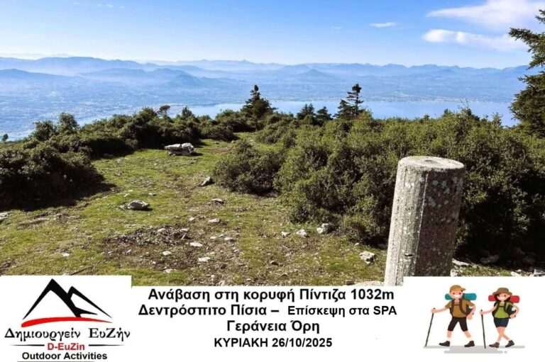 Την Κυριακή 26/10/2025 σας προσκαλούμε να πεζοπορήσουμε έως στη κορυφή Πίντιζα με εκκίνηση από το γνωστό χωρίο Πίσια Περαχώρας στα Γεράνεια Όρη στο Λουτράκι. Μια