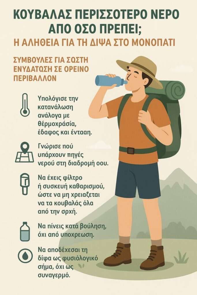 - Ενυδατωθείτε σωστά τουλάχιστον με 2 λίτρα το καλοκαίρι + ισοτονικά ποτά. Επιλέγοντας έναν ασκό αντί για μπουκάλι είναι πιο εύκολο να έχετε άμεση πρόσβαση στο νερό όποτε το χρειάζεστε.